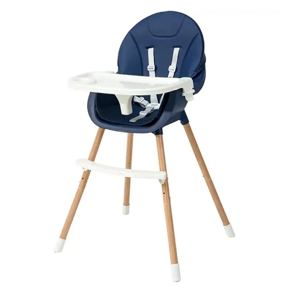 Chaise haute repas bébé évolutive en bleu foncé, avec harnais de sécurité et plateau amovible, idéale pour les repas des enfants.