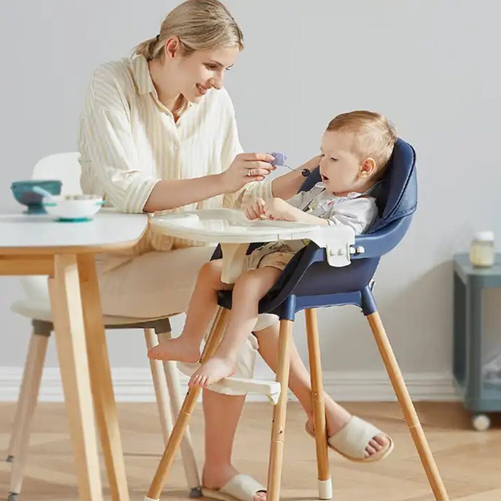 Adjustable baby high chair with wooden legs and padded seat for optimal comfort during meals.
